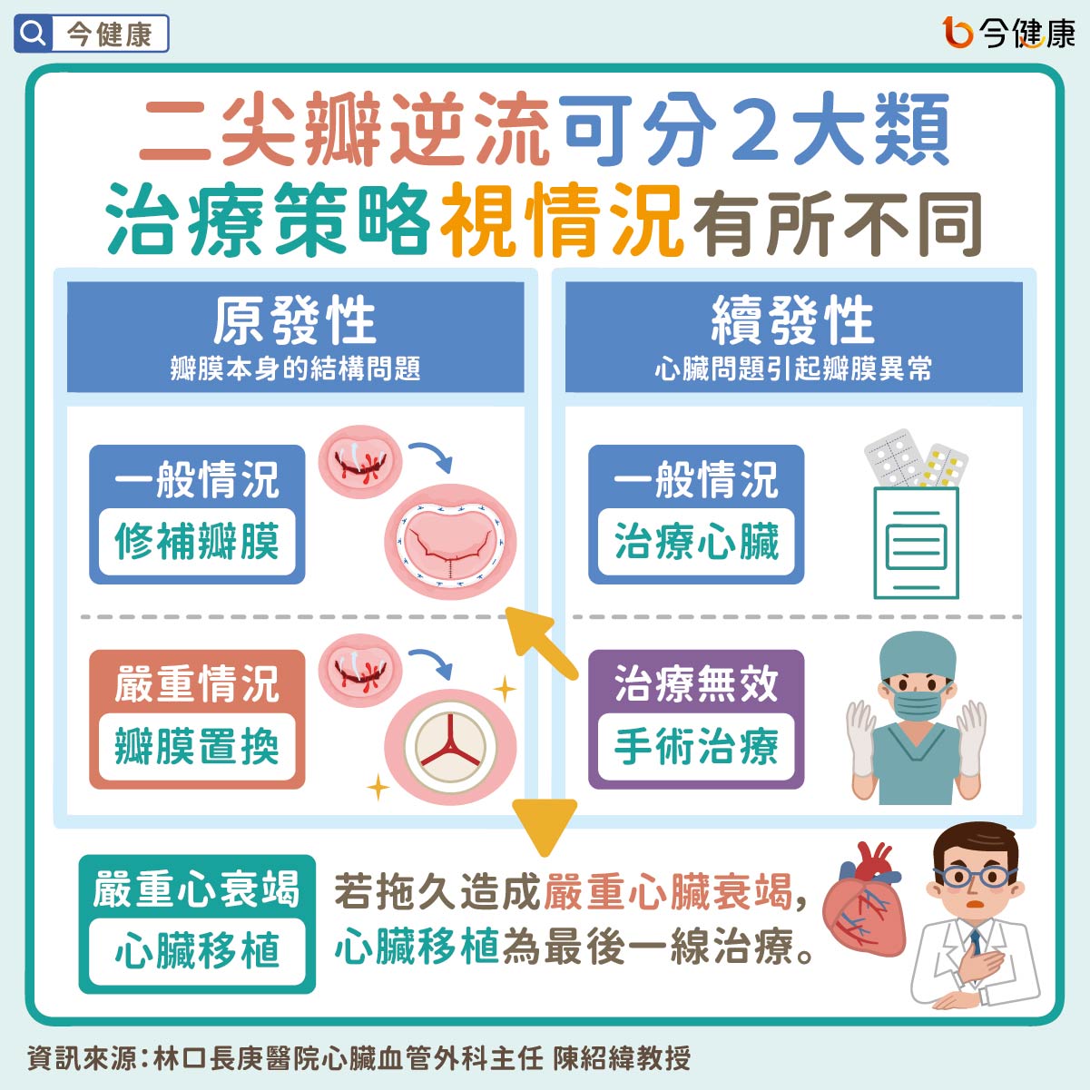 「二尖瓣逆流」可分2大類,治療策略視情況有所不同。